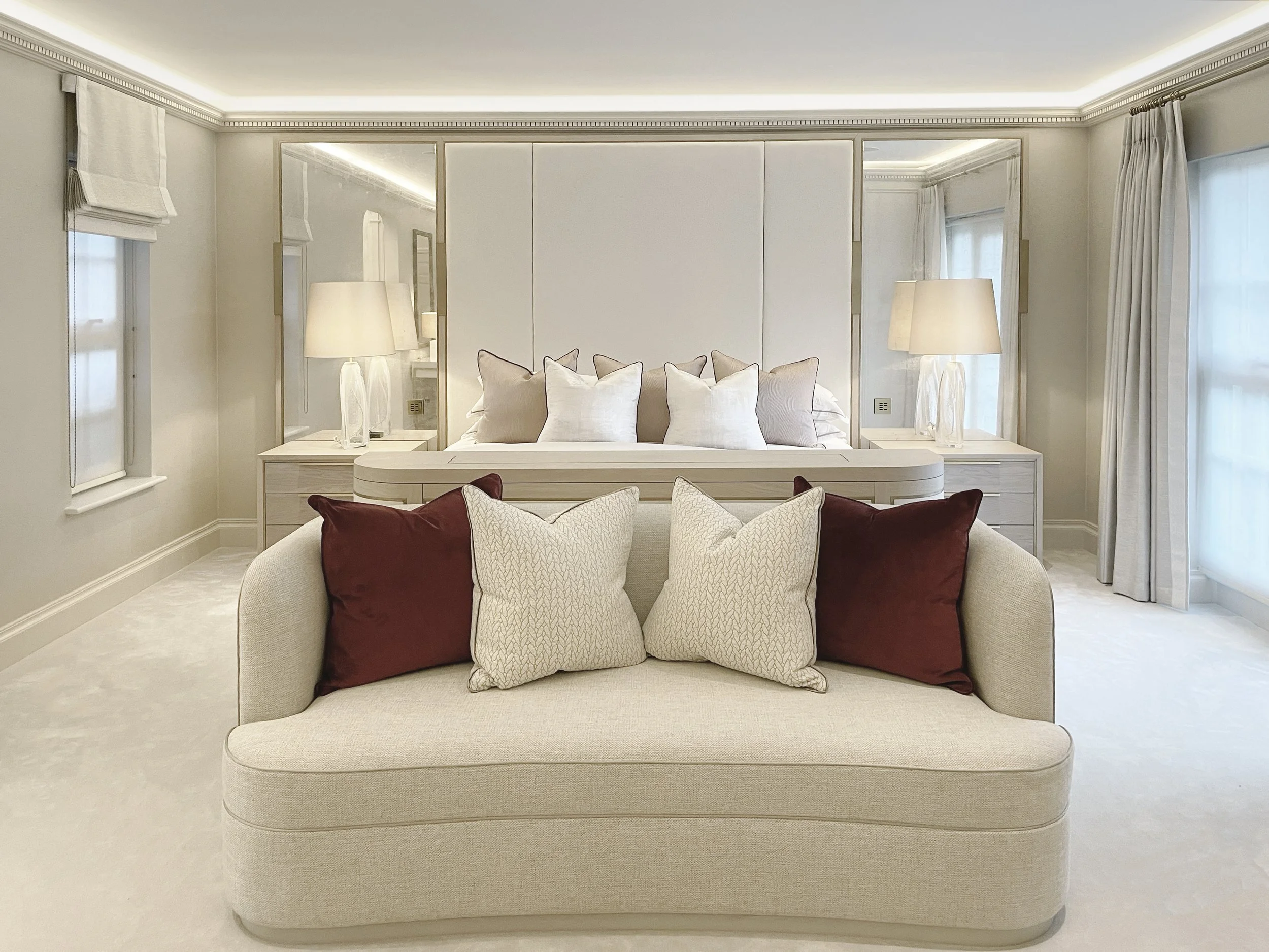 If you are after a calm bedroom then opt for neutral tones such as light creams or soft greys. You can always incorporate slightly bolder colors in items that can be easily changeable such as scatter cushions or throws. For this bedroom, we used blush pink and burgundy as accent tones.